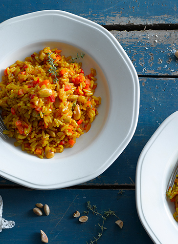 Calentamos la Cacerola tapada 3' a fuego medio. Agregamos el aceite y las especias. Luego incorporamos el arroz y lo rehogamos a fuego mínimo hasta que se impregne del aceite.