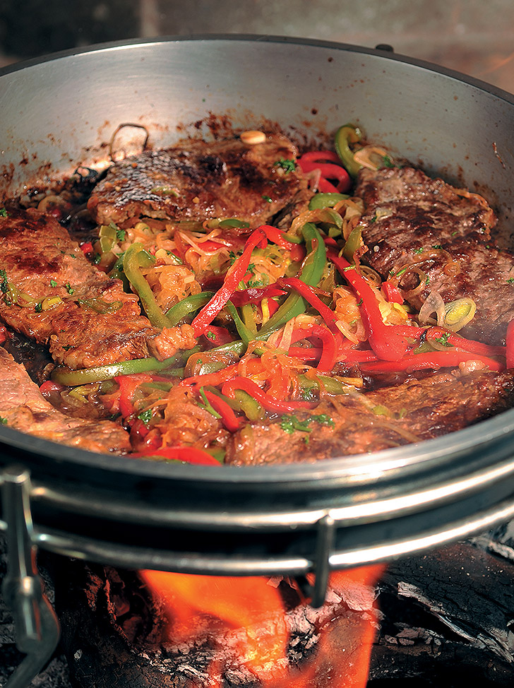 Una vez caliente el Disco, agregamos el aceite de oliva desde los bordes. Luego colocamos los bifes y los doramos de ambos lados a fuego fuerte.
