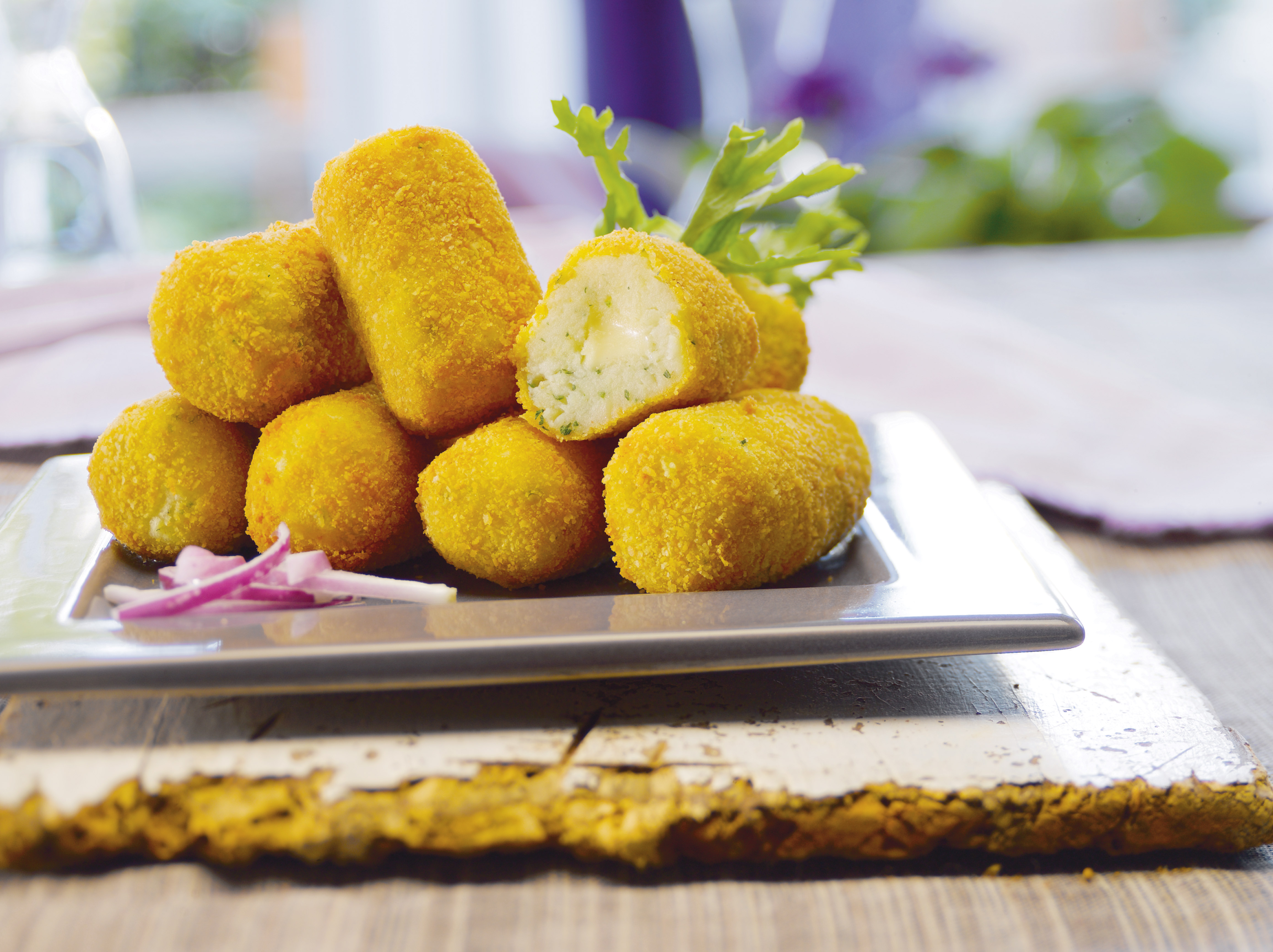 Tomamos una porción de la preparación, colocamos en su interior un cubo de queso y cerramos dándole forma de croqueta. Repetimos la operación con el resto de la mezcla.