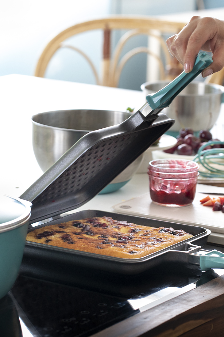 En un bowl mezclar los huevos con el azúcar sin batir. Incorporar la mezcla de chocolate blanco y manteca, luego la harina tamizada. Mezclar y volcar la preparación en la Flip. Agregar por encima los frutos rojos cortados en cuartos, mezclados con la mermelada. Esparcir la mezcla por encima de la masa.