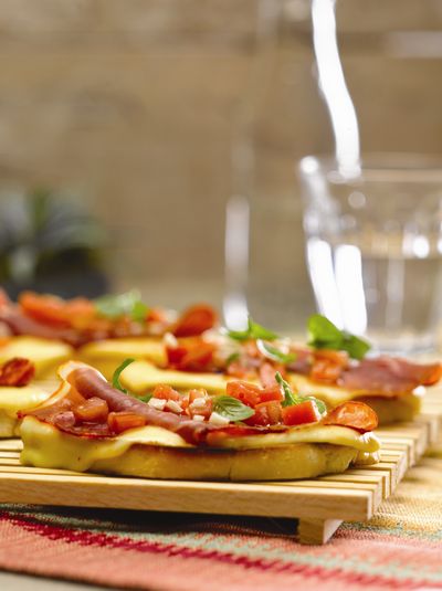 Damos vuelta, cubrimos con el queso cortado en rodajas, el jamón crudo y por último con la mezcla de ajo, tomate y albahaca.