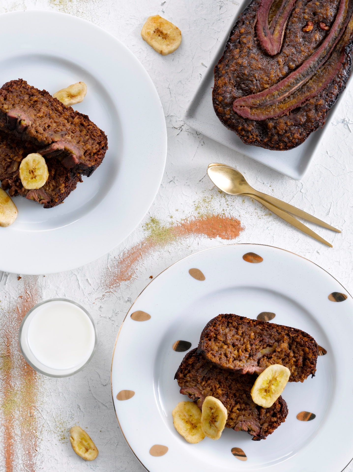 En un bol batimos los huevos, el azúcar, el cacao, el aceite, la esencia de vainilla y agregamos el puré de banana hasta obtener una preparación cremosa.