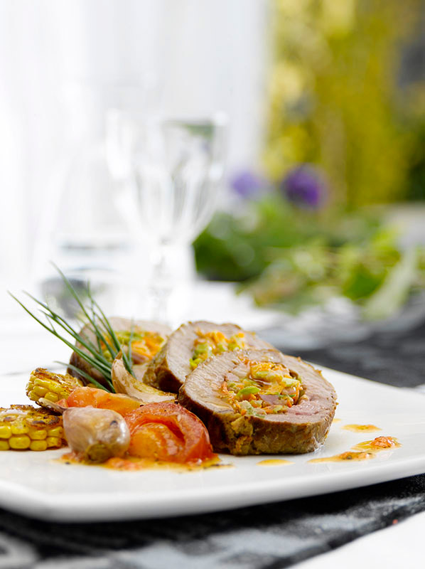 6 - Luego agregamos los pimientos cortados en juliana, los tomates, los choclos y los ajos; tapamos y continuamos a fuego mínimo hasta finalizar la cocción.