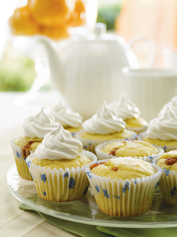 Colocamos una cucharada de mezcla en los pirotines (colocarlos de a dos, para evitar que la preparación se expanda durante la cocción). En el centro, distribuimos una cdta de dulce de leche. Cubrimos con más mezcla, sólo hasta la mitad del pirotín y los colocamos en el complemento.