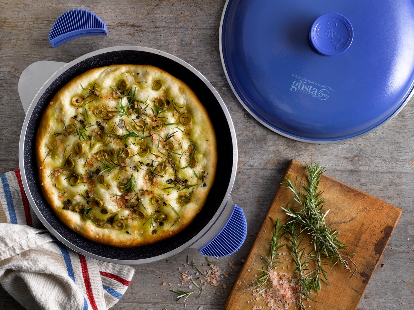 Extendemos la masa de forma pareja en la Sarten lubricada, esparcimos las aceitunas y romero hundiéndolo con los dedos y esparcimos aceite de oliva, sal gruesa y dejamos reposar con la Sarten tapada 15 min.