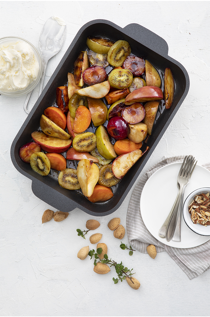 Precalentar la Bifera a fuego máximo y una vez que la Bifera tomó temperatura, agregar el azúcar y el aceite de oliva. Grillar las frutas de ambos lados y una vez doradas, incorporar unas gotas de aceto balsámico y dejar evaporar unos segundos.