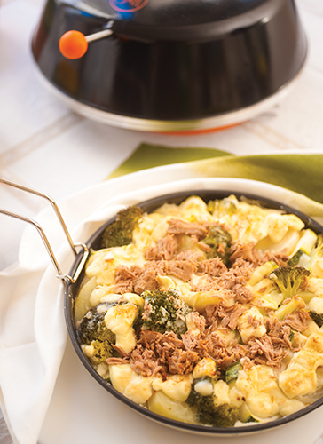 • Abrimos el Ecohorno, cubrimos las verduras con la mezcla y espolvoreamos con el queso rallado; cerramos y continuamos a fuego medio hasta obtener el dorado deseado.