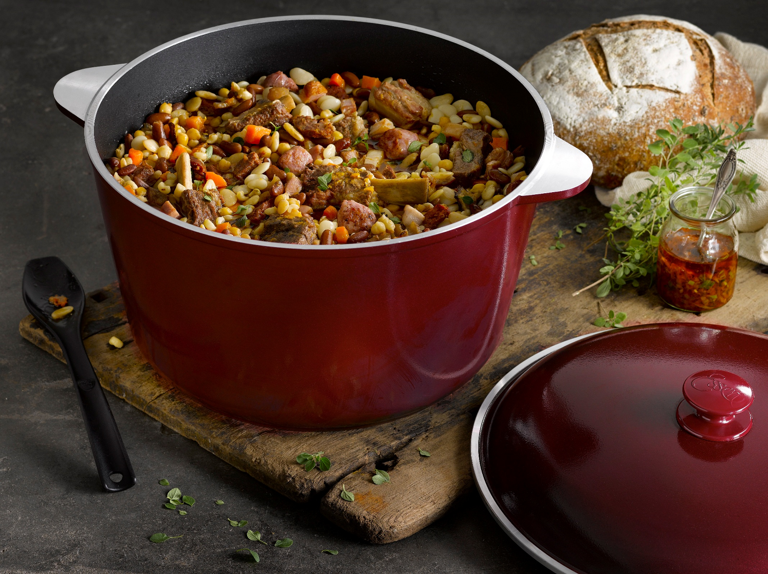 · Agregamos el aceite, la carne, el chorizo, el cuerito y la panceta y doramos.