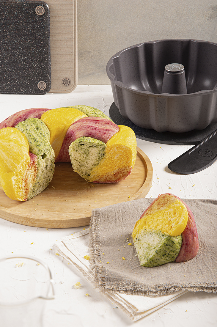 Estiramos cada masa con forma de cilindro y hacemos una trenza. La colocamos en el Savarín lubricado con aceite de oliva y dejamos fermentar 30’.