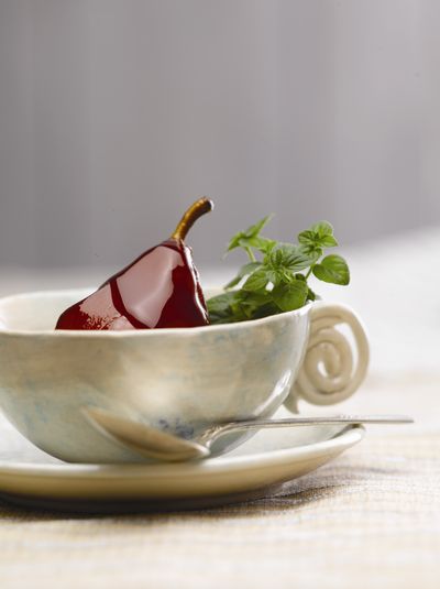 Dejamos enfriar las peras en el vino. Las retiramos y acomodamos en una fuente.