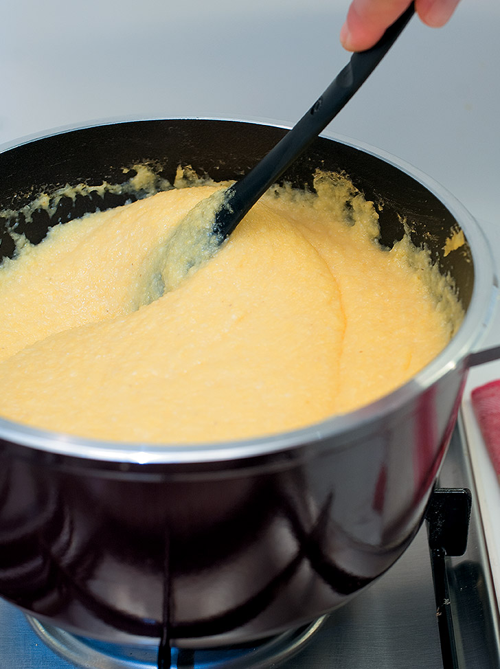 Colocamos en la Cacerola la harina de maíz junto con el agua y los condimentos (todo en frio).