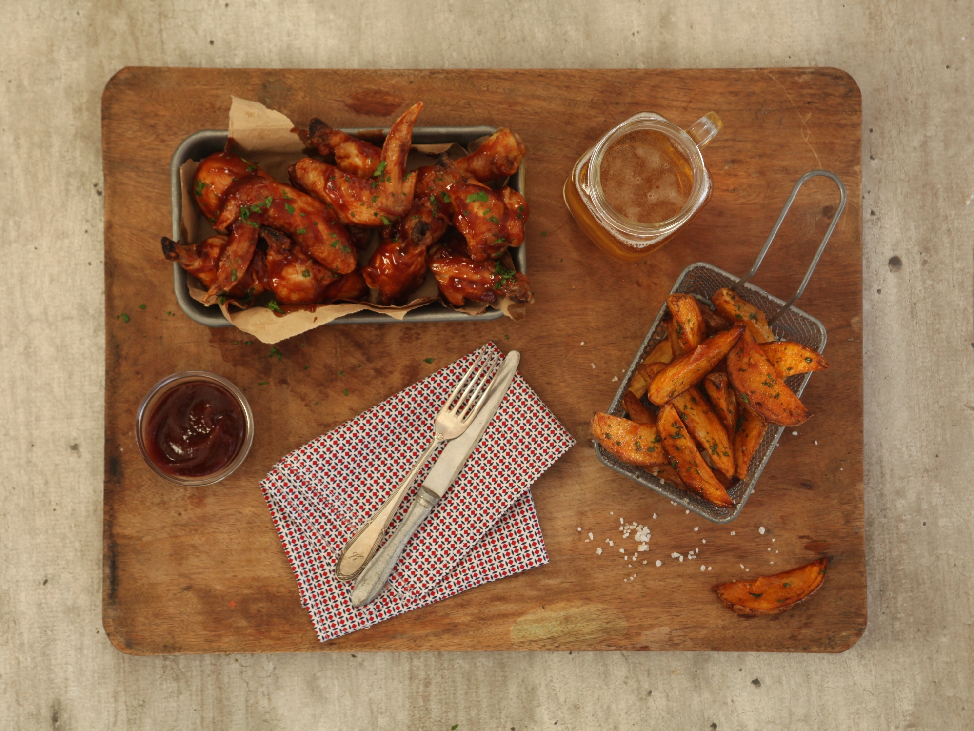 Para la salsa continuamos con el wok y el fondo de cocción que quedó de la cocción del pollo. Añadimos la cebolla, los dientes de ajo, el azúcar negra, la fécula de maíz, la salsa de tomate, el comino, la paprika o pimentón, la mostaza, la miel, el extracto de tomate, la salsa inglesa, el vinagre y el vino blanco. Dejamos reducir hasta que espese la salsa y finalmente sumamos las presas de pollo cocidas, continuamos unos minutos más y servimos con ciboullete picado. Podemos acompañarlo con papas.