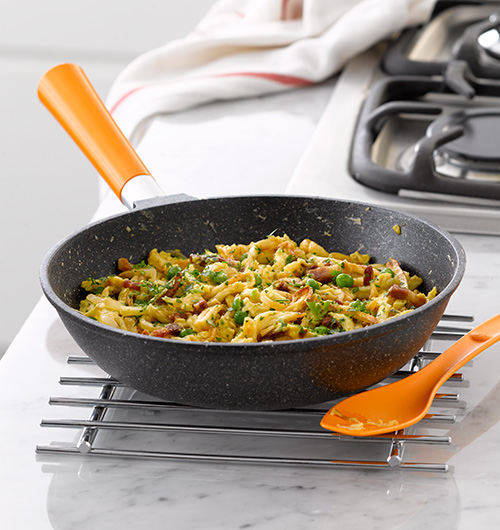 • Agregamos las arvejas y las papas fritas. Revolvemos y condimentamos.