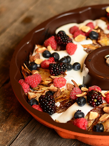 Para la rosca, una vez finalizada la cocción de la rosca, dejamos enfriar unos minutos y terminamos por arriba con el glaseado, los frutos rojos y las almendras fileteadas.