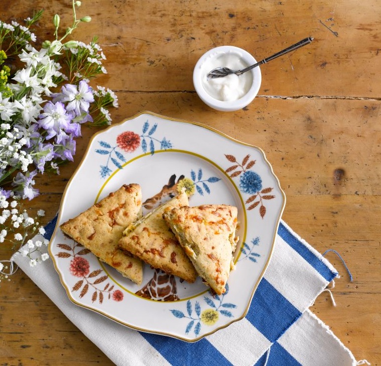 Mezclamos todos los secos. Agregamos la manteca y hacemos un arenado, incorporamos la ralladura y los líquidos, estiramos la masa de 1 cm aprox. La doblamos a la mitad y encimamos la masa, cortamos en triángulos. Cocinamos en el Ecohorno por 15'. Apagamos y dejamos reposando sin destapar 5'.