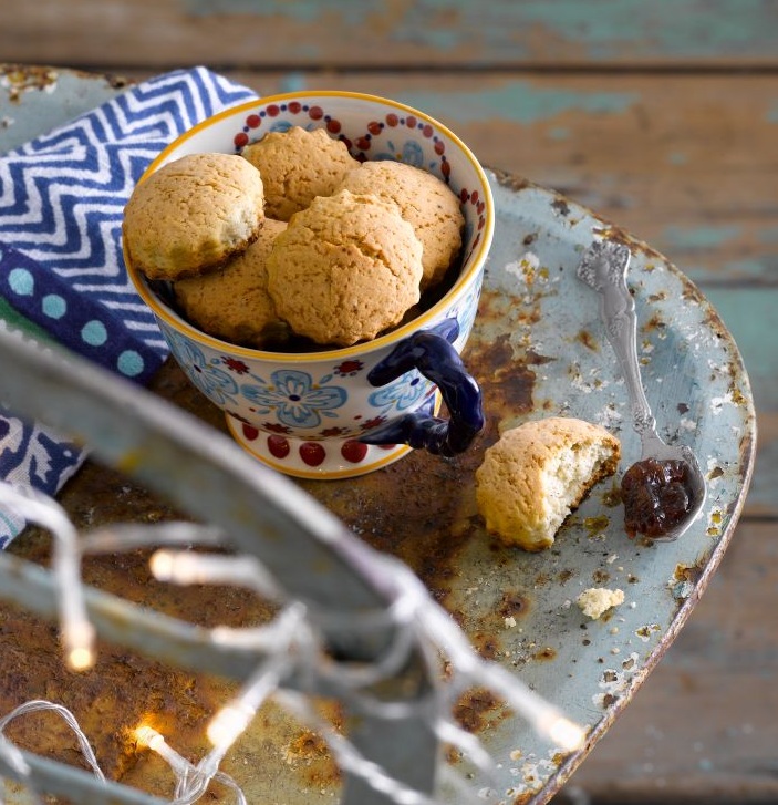 Mezclamos todos los secos, agregamos la manteca y hacemos un arenado. Incorporamos la ralladura y los líquidos, estiramos la masa de 1 cm aprox. La doblamos a la mitad y encimamos la masa, cortamos con cortante. Cocinamos en el Ecohorno 15'. Apagamos y dejamos reposar sin destapar 5'.