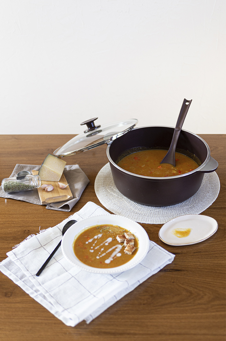 Precalentamos la Cacerola. Agregamos aceite de oliva y salteamos la cebolla, el pimiento, la calabaza, el puerro, la zanahoria y la batata en cubos. Agregamos el caldo, el laurel y el ajo y bajamos el fuego a mínimo. Cocinamos hasta que los vegetales estén tiernos. Condimentamos con curry, ají molido, sal y pimienta. Procesamos la sopa e incorporamos la leche de coco.