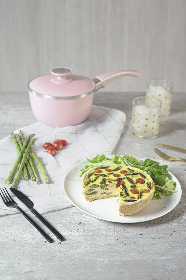 Volcamos la mezcla de huevo sobre la masa y agregamos el salteado de cherry y cebolla.