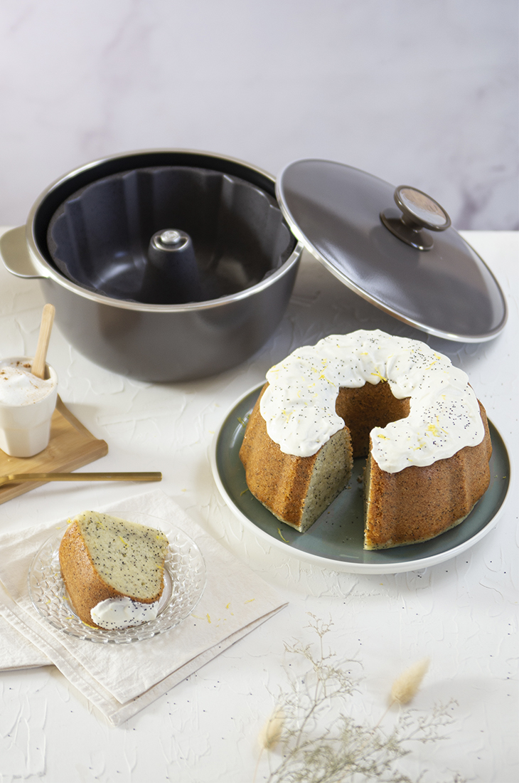 Decoramos la torta con el frosting, semillas y ralladura de limón.