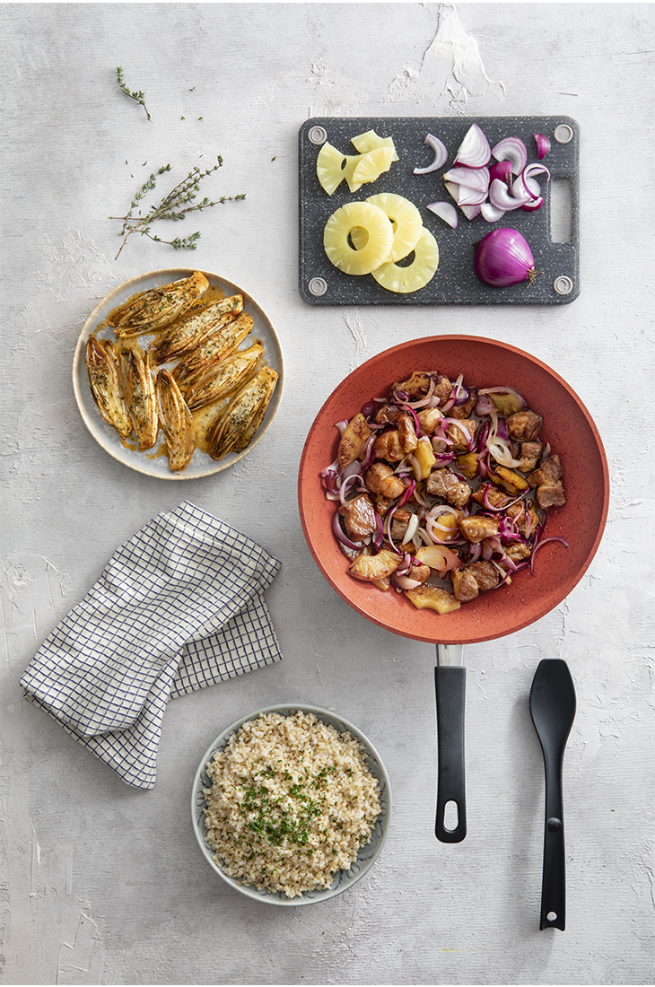 Servir el wok de bondiola agridulce con el arroz yamaní y las endivias.