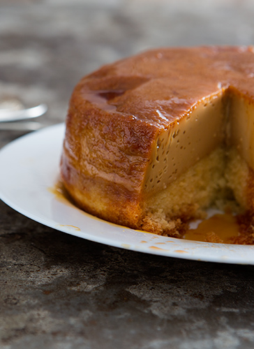 • Volcamos en la Cacerola, primero la mezcla del flan y luego sobre éste distribuimos la mezcla de bizcochuelo.