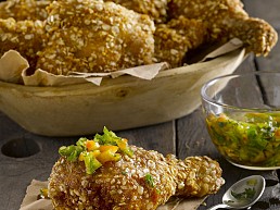 Rollo de milanesa de pollo relleno con jamón y queso, acompañado de cubos papas y batatas