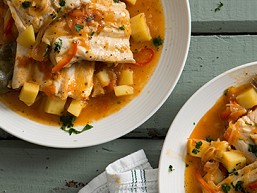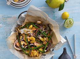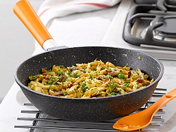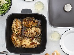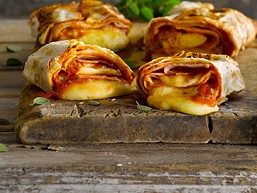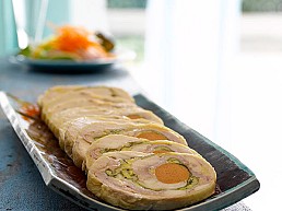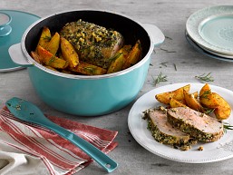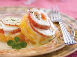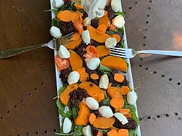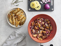 Milhojas de papa con ensalada tibia de peras y queso azul