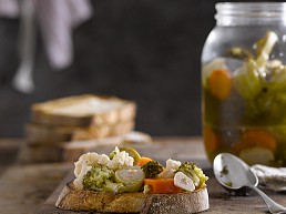 Cherrys confitados con burrata, pesto de rúcula y tostón de pan de campo