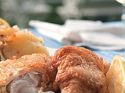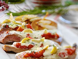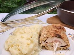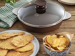 Milanesas de pollo rebozadas en pan rallado y queso. Acompañadas de chips de batatas.
