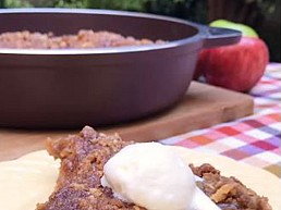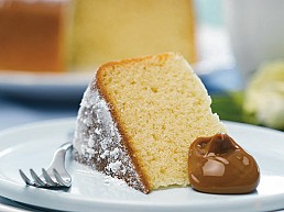 Bizcochuelo húmedo con duraznos caramelizados, garrapiñada de almendras, acompañado de crema batida