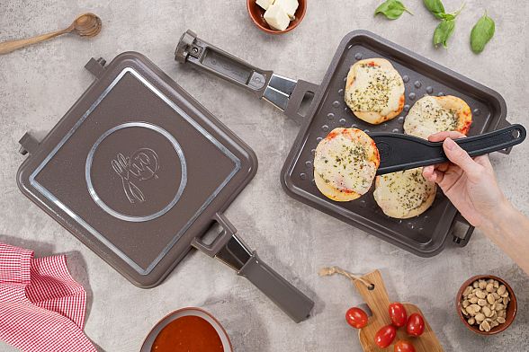 Su cierre traba dial permite un giro “flip” firme y seguro, y su sistema desmontable transforma cuerpo y tapa en sartenes individuales.