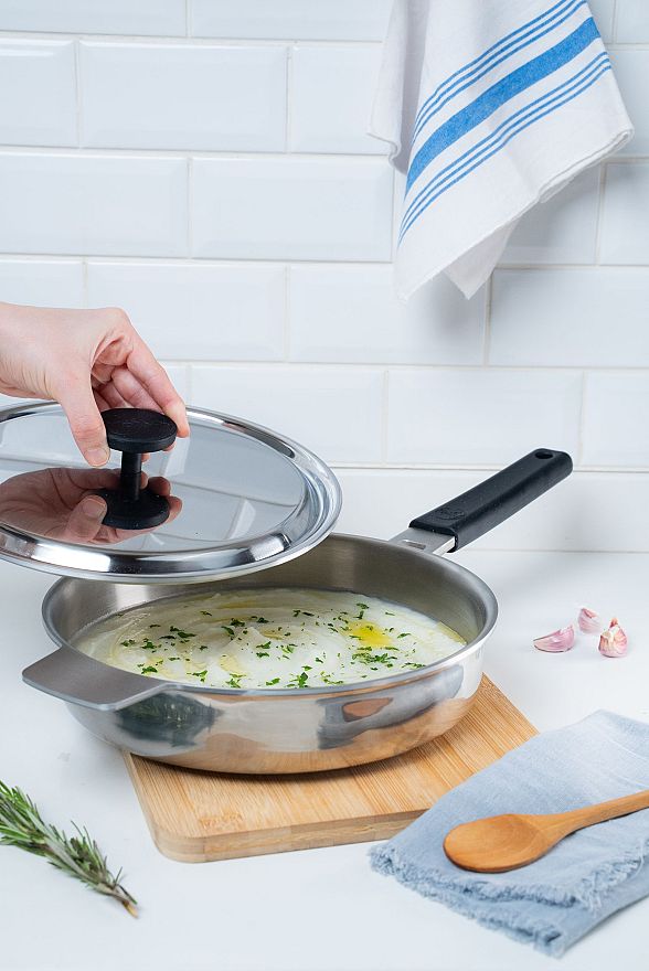 Gracias a la tecnología Nova Steel, ofrece una cocción más versátil y eficiente, ideal para preparar desde platos dulces hasta guisados, panes o carnes. Su sello de vapor mantiene la humedad y el sabor de los alimentos, mientras que el mango con disipación térmica asegura un agarre cómodo y seguro.