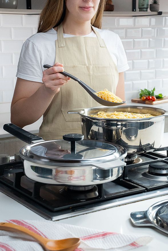 El Sartén Fusión de 24 cm combina diseño, innovación y calidad para transformar cada comida en una experiencia única. Su estructura tricapa garantiza una distribución homogénea del calor en 360°, logrando cocciones parejas y resultados perfectos.