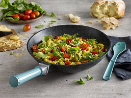 • El Wok está recubierto interna y externamente por un antiadherente de 3 capas de color negro agrisado de alta calidad.
